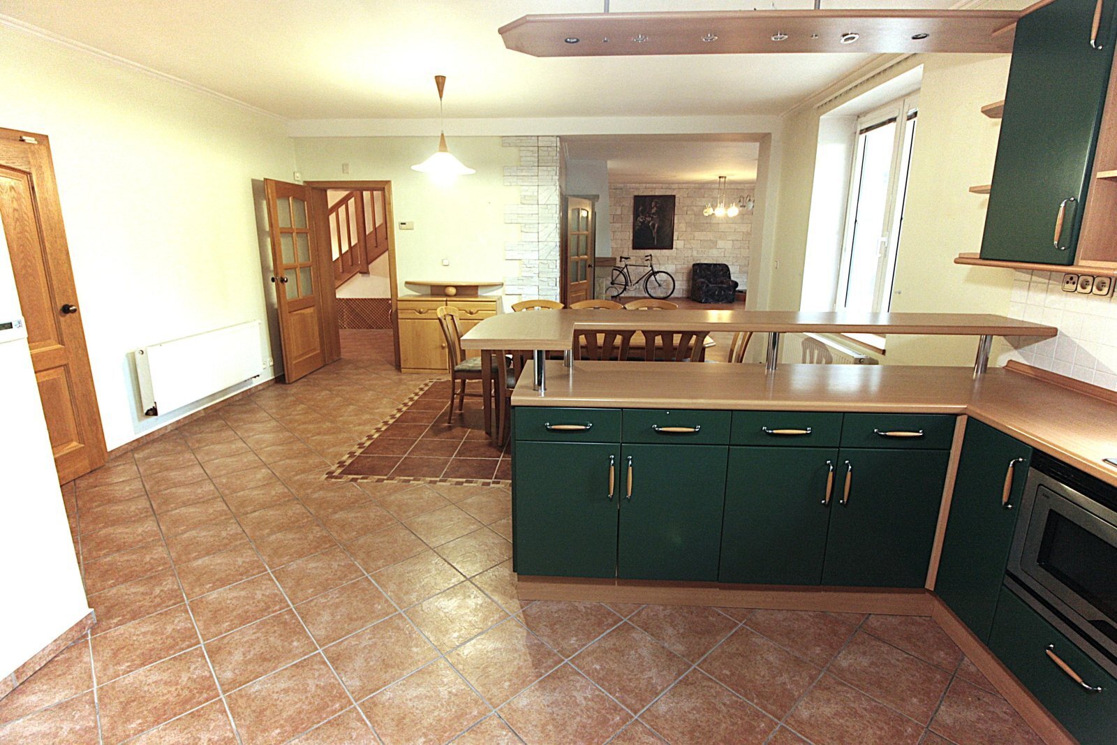 Praha-západ, obec Psáry, Dolní Jirčany, nabízíme k pronájmu velmi pěkný, samostatně stojící rodinný dům, který je dispozičně řešen jako 5+1, dvojgaráž (45 m2), terasa a krásná zahrada (792 m2), celková rozloha pozemku je 1.026 m2. Přístup k domu je ze soukromé, klidné ulice s vjezdem přes el. závoru. Dům má dvě podlaží a půdu. V 1.podlaží se nachází velmi prostorný obývací pokoj (44 m2) s krbovými kamny, se vstupem do udržované zahrady, která nabízí klid a příjemné soukromí. Kuchyň a jídelna je propojena s obývacím pokojem. V 1. podlaží se nachází technické zázemí domu, prádelna, sušárna. Pro 1. podlaží je k dispozici koupelna a WC. Po pohodlném, dřevěném schodišti je vstup do druhého podlaží domu, kde se nachází čtyři pokoje, velká mramorová koupelna s vanou a sprchovým koutem, WC. Úložný prostor je zajištěn šatnou a komorou. Celková užitná plocha domu je 300 m2. Energetickou úspornost domu umožňuje tepelné čerpadlo, náklady snižuje také voda z vlastní studny. V místě je dobrá vybavenost, výborná dostupnost do Prahy přes Pražský okruh nebo D1, zastávka autobusu na metro C Budějovická nedaleko domu. K dispozici dohodou.