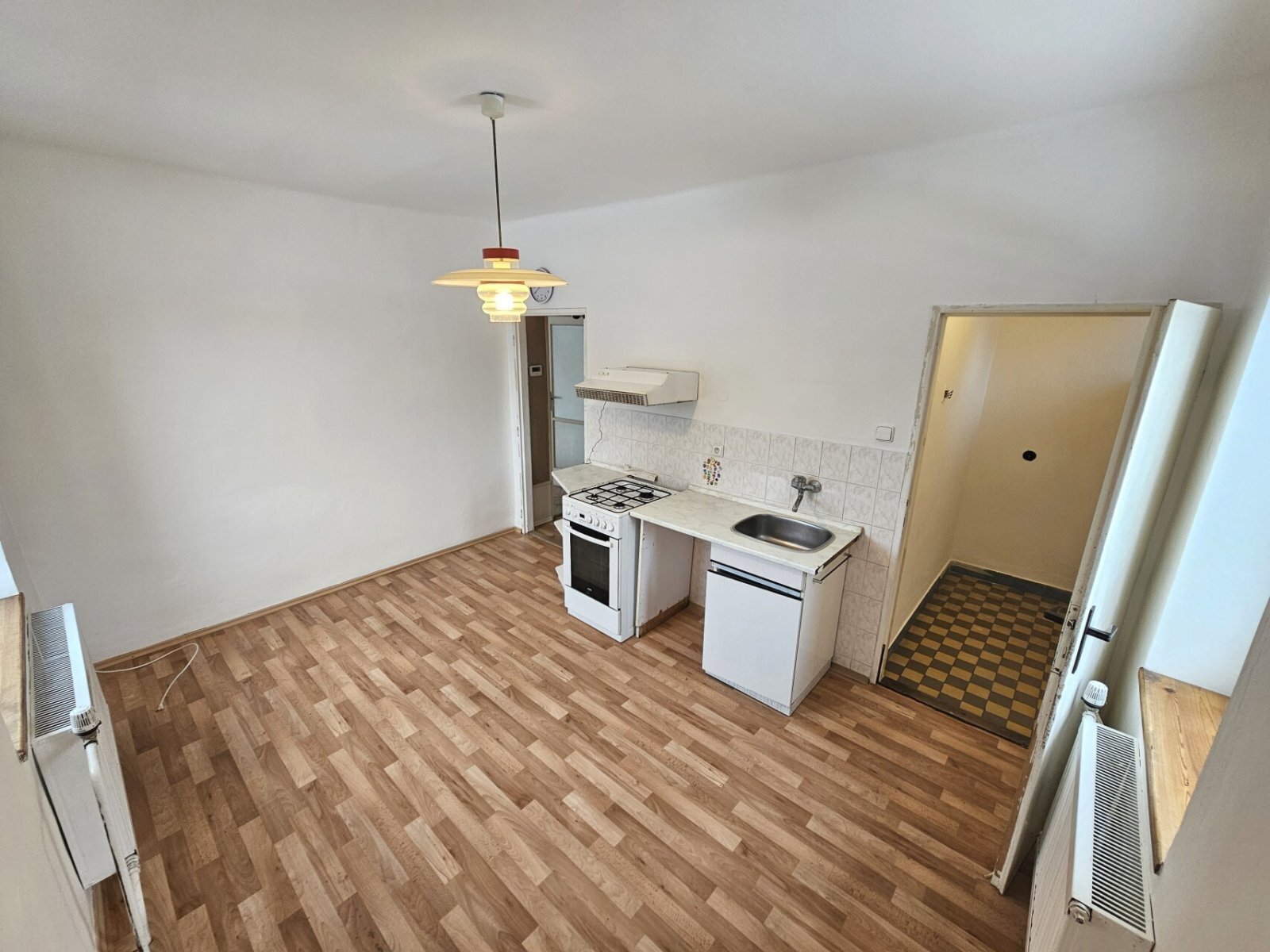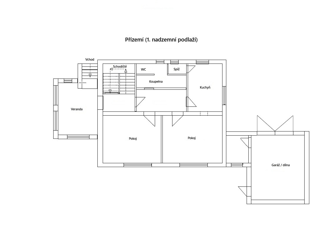 Přízemí - kuchyň (12,5 m2), dva pokoje (21,1 a 15,2 m2, větší je možné částečně propojit s kuchyní), koupelna s WC, spíž, chodba, veranda