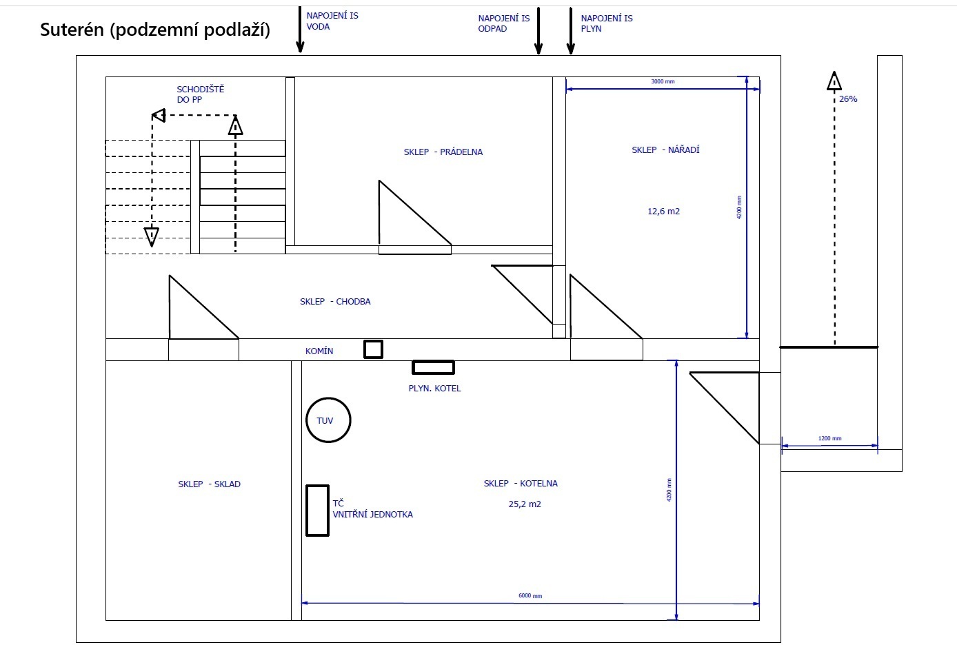 Suterén - celkem 68 m2, technická místnost, sklad, spíž, prádelna.