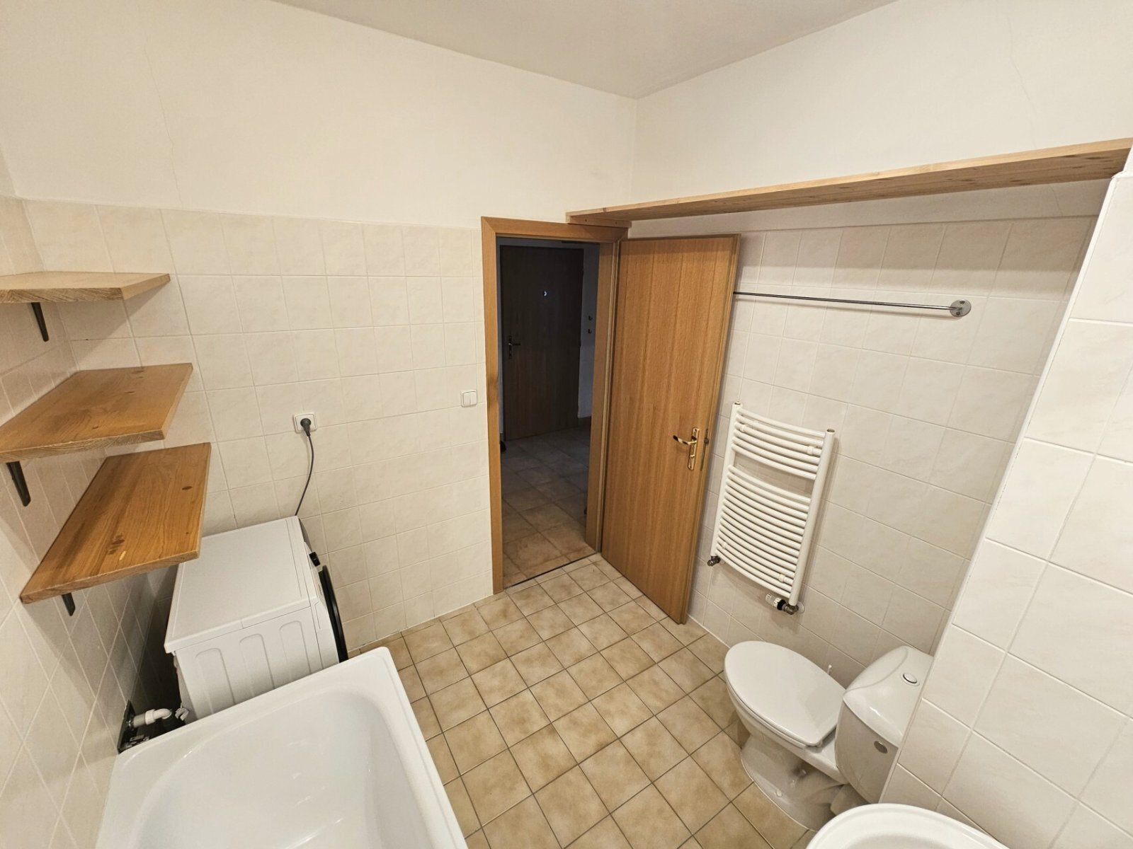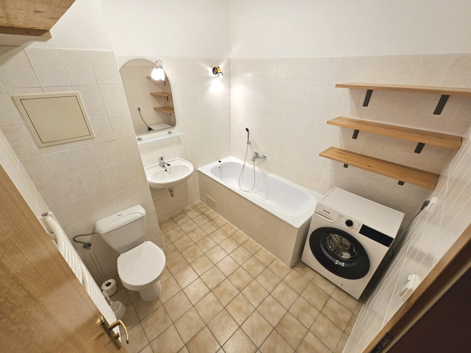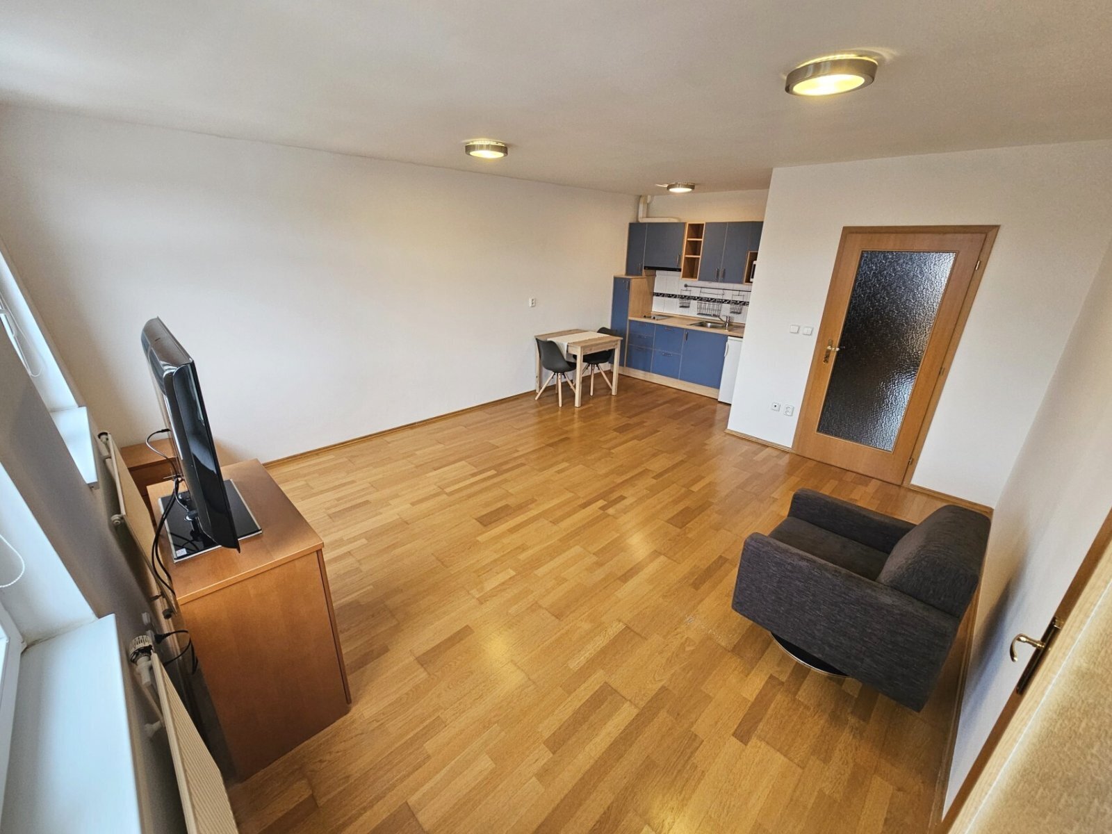 V bytě se nachází velký pokoj s kuchyňským koutem (25 m2), pracovna (4,3 m2, lze vyřešit i jako ložnice s jednolůžkem), prostorná předsíň (6 m2) s vestavěnými skříněmi a koupelna (5,2 m2, pračka) s vanou a s WC.