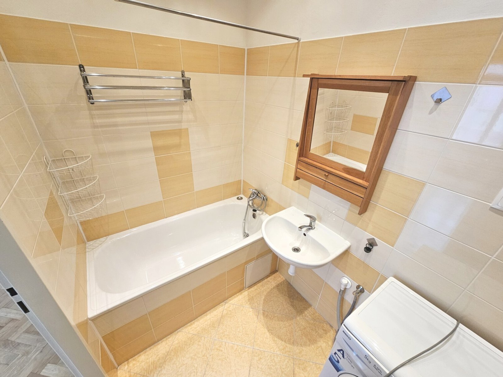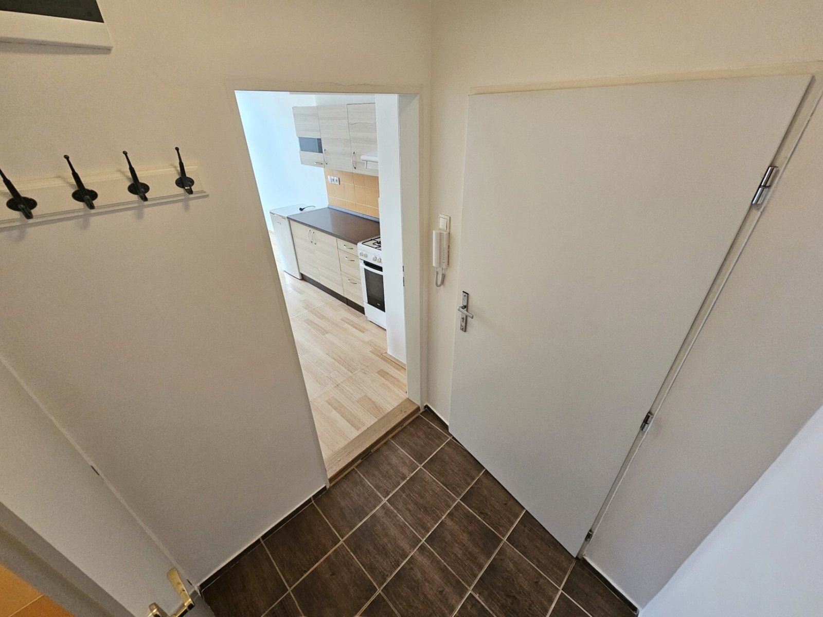 V bytě se nachází obývací pokoj s kuchyňským koutem a spíží (17 m2, kombinovaný sporák, menší lednice, digestoř) + ložnice (14 m2) + koupelna s vanou (3 m2) + samostatné WC + předsíň.