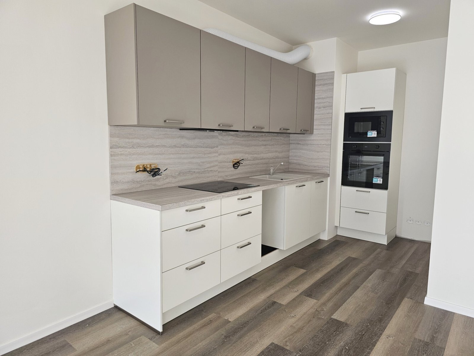 Myčka a elektrické zásuvky u kuchyňské linky budou dokončeny tento týden.