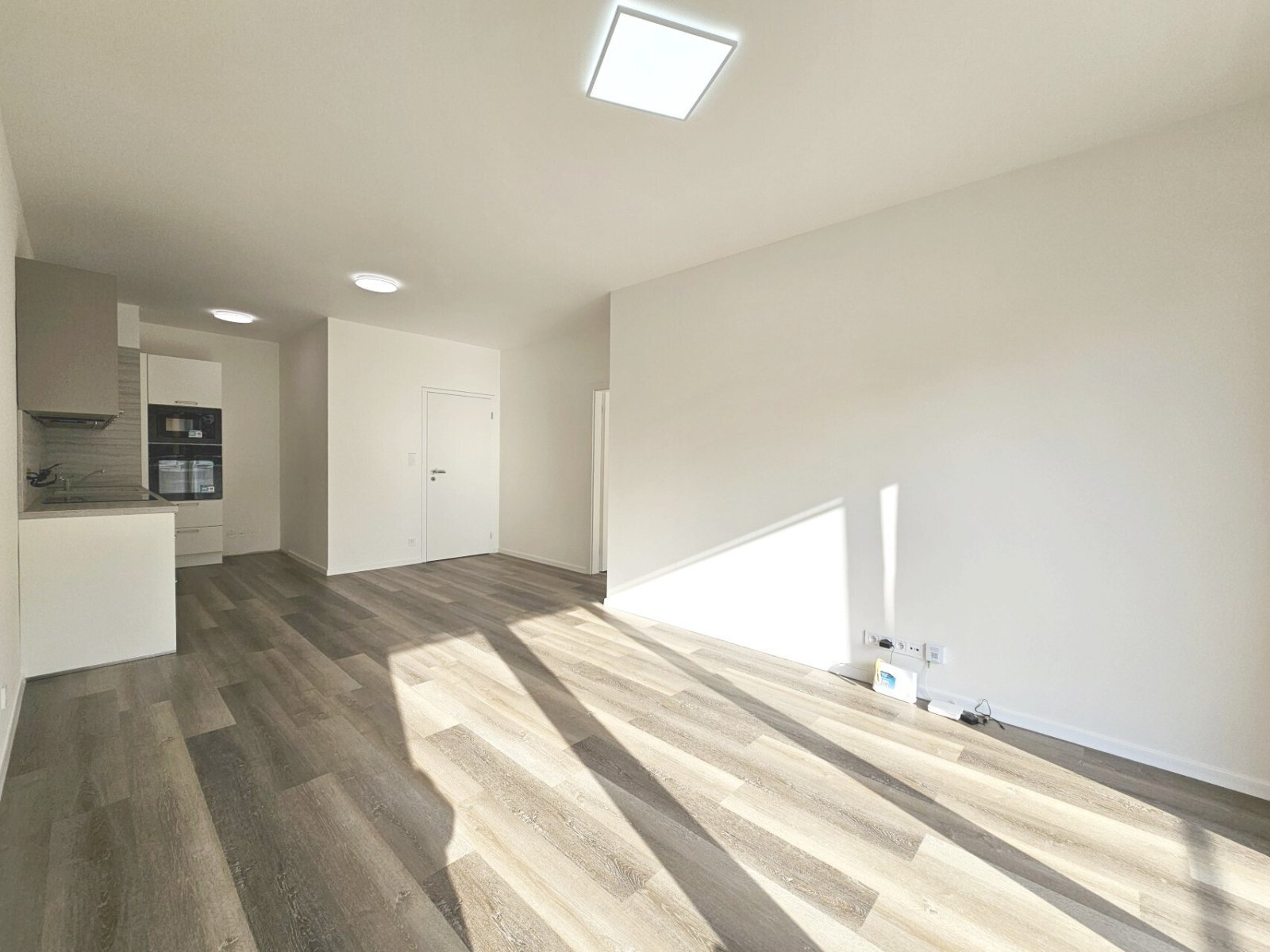3) obývací pokoj (26,4 m²) s kuchyňskou linkou s vestavěnými spotřebiči (el. trouba, mikrovlnná trouba, indukční varná deska, myčka bude doplněna, lednice možná po dohodě)