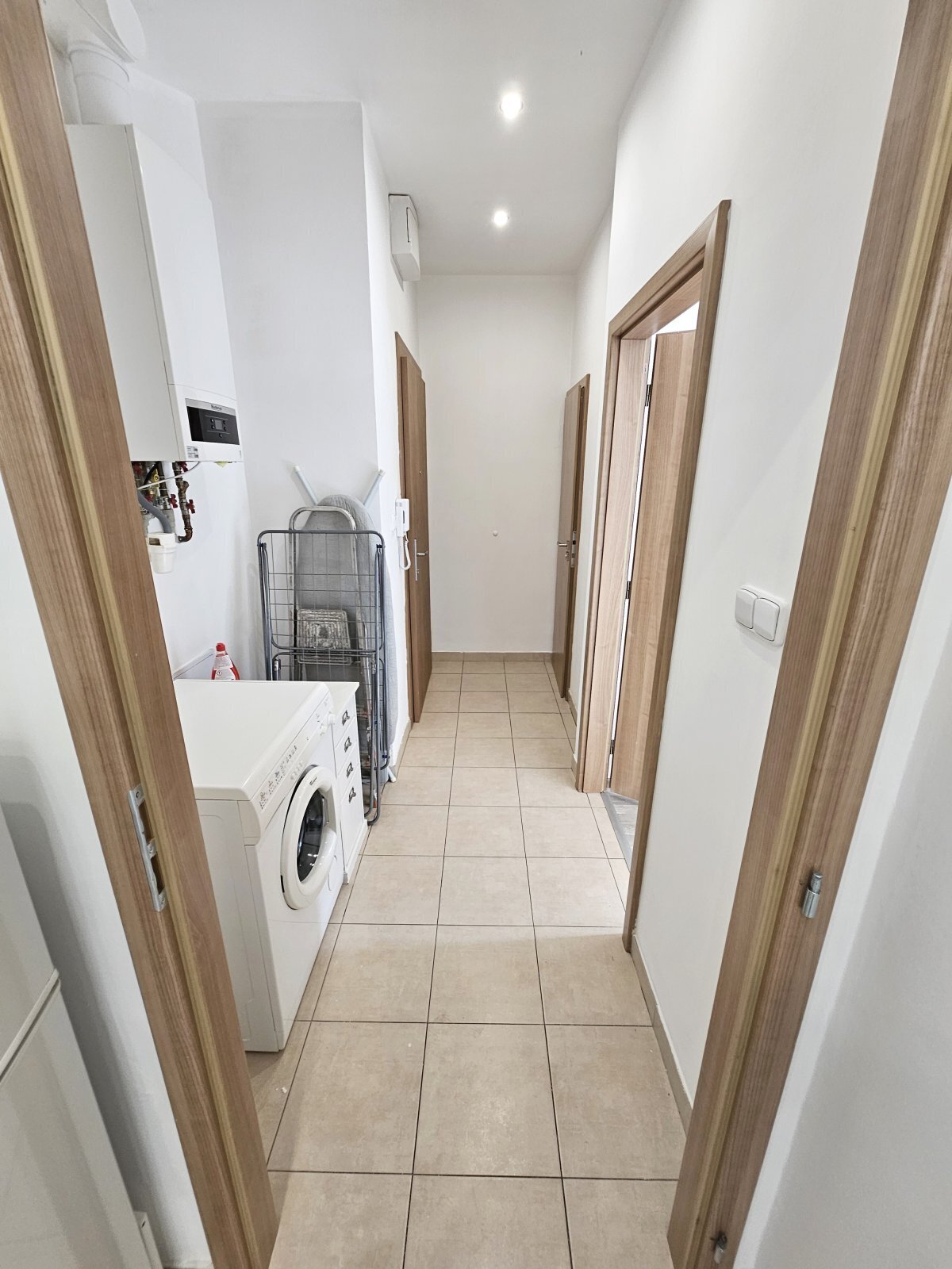 V bytě se nachází obývací pokoj s kuchyňským koutem (kuch. linka, el. trouba s plynovým sporákem, digestoř, lednice, myčka), ložnice, koupelna se sprchovým koutem a s WC, předsíň (pračka) a k bytu náleží i balkón.